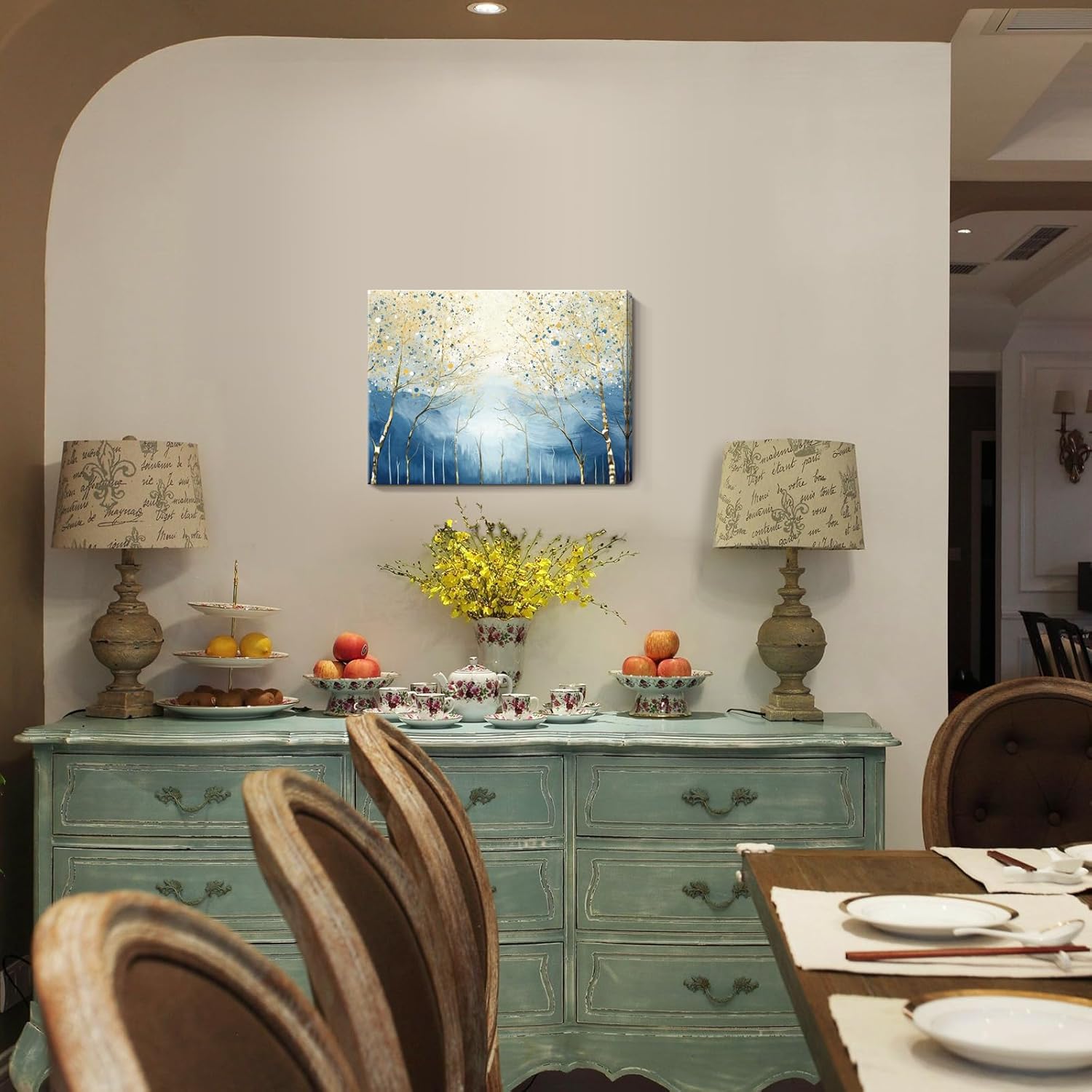 - Modern Abstract Forest Design: This minimalist landscape art captures slender birch trunks reaching toward a luminous sky, showered with soft golden and navy-blue splatters that evoke morning light filtering through the trees. The calming blend of cool and warm hues makes it an effortless accent for any room.