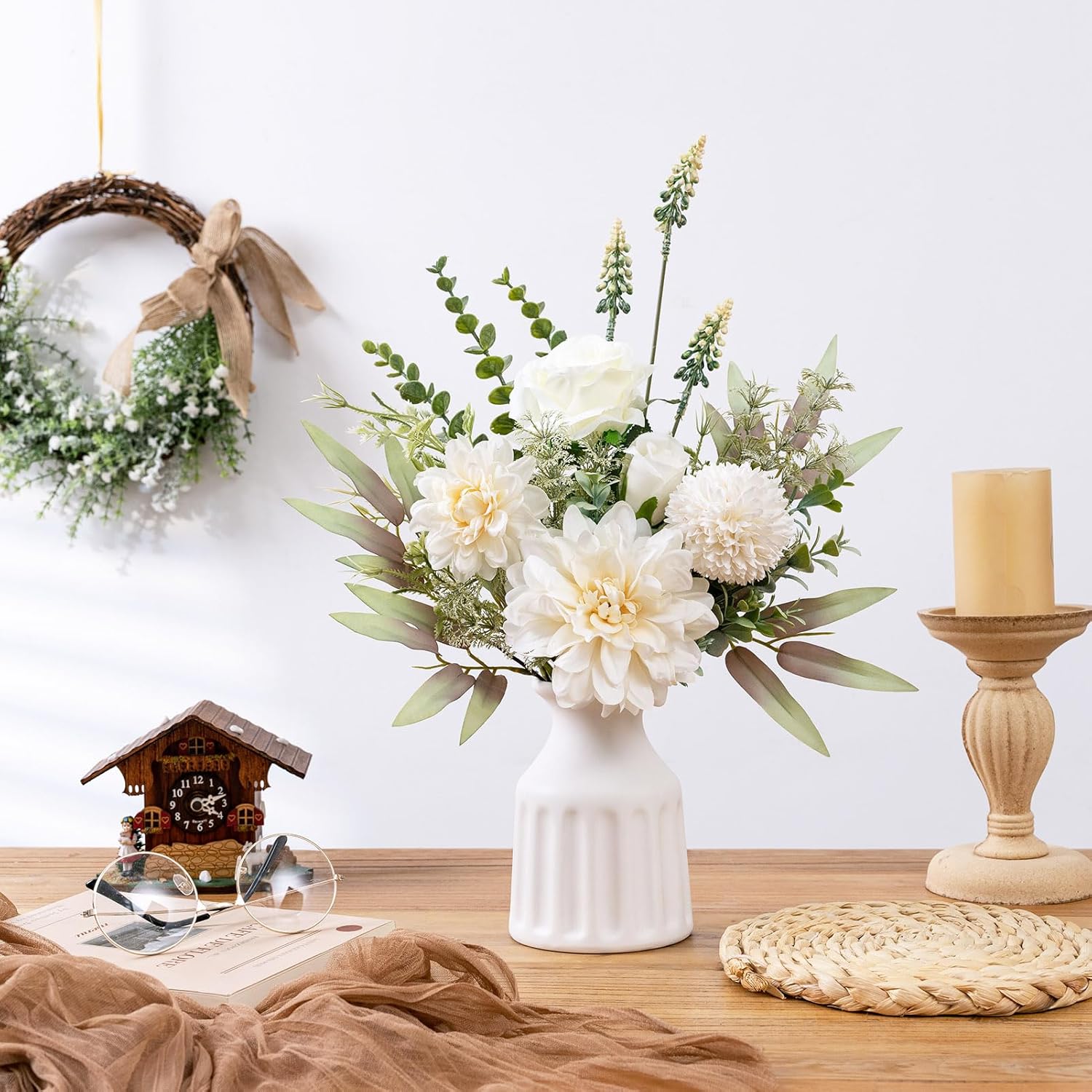 Fake Flowers in Vase, Artificial Flowers with Vase, 15.7'' Floral Arrangements for Dining Table Centerpiece Decor, Silk Roses & Faux Dahlia Bouquet for Farmfouse Kitchen Coffee Table Decor (White)