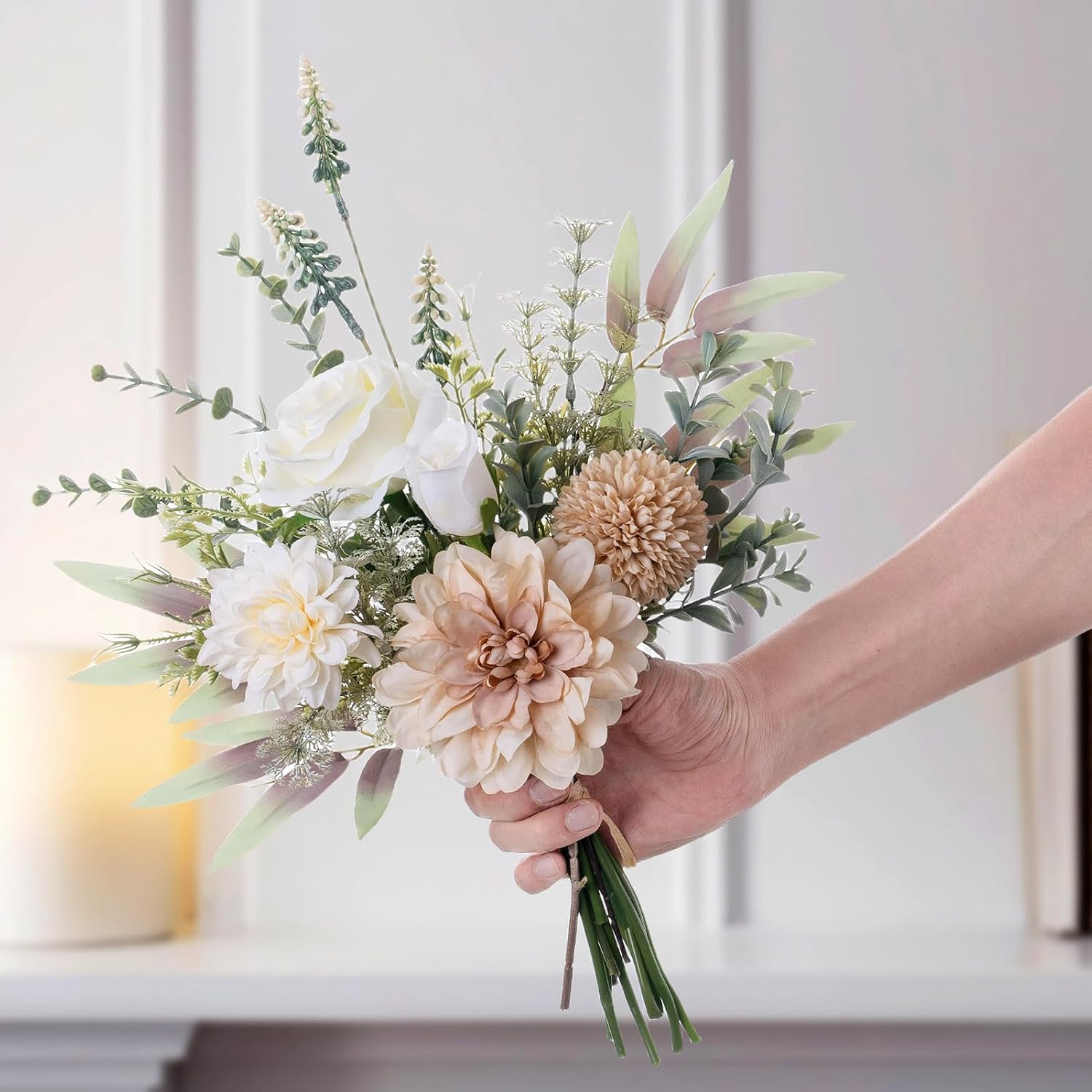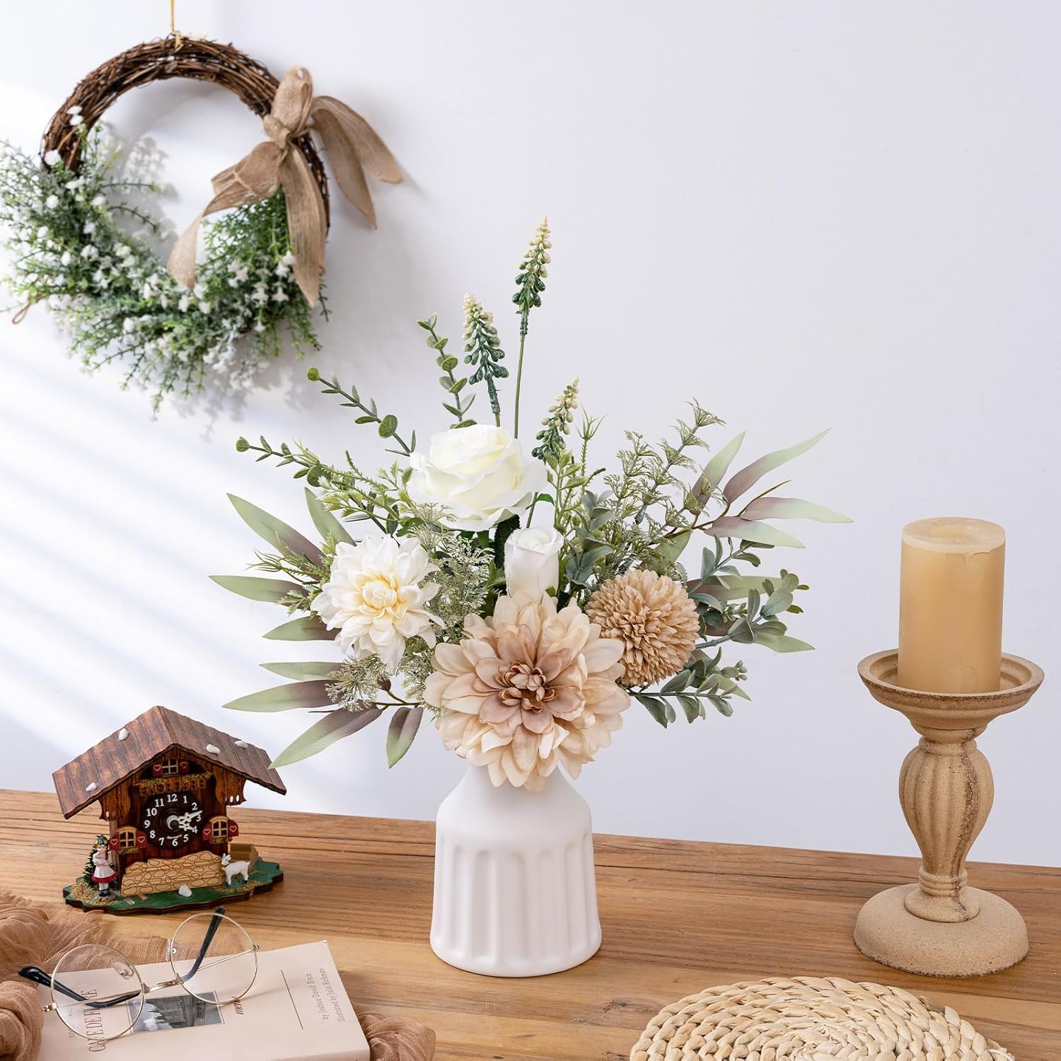 - Complete Artificial Flower Set with Vase: This artificial flowers in vase for decoration includes lifelike fake dahlia, kiku flower, roses, fake plants and a white ceramic vase. Perfect as a table centerpieces for dining room, kitchen table decor, farmhouse table decor, coffee table decor, mantel decor, and rustic-style interiors.