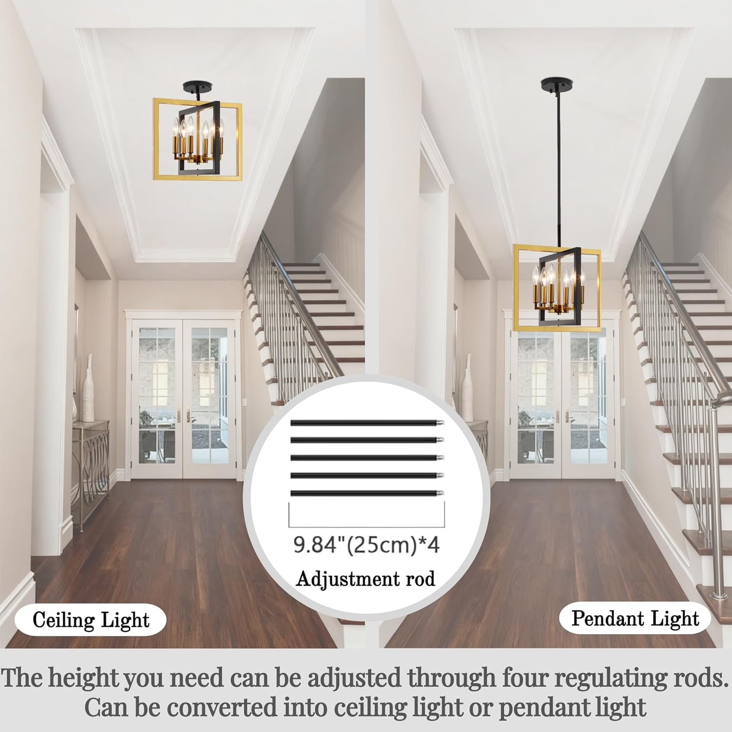 - Ajustable Height & Angle: Hanging Height: 15.8" - 55.1". The kitchen pendant light features 4 adjustable rods, each measuring 9.84 inches, allowing you to customize the hanging height of this dining room chandelier to suit your space and create the ideal atmosphere. Additionally, the rod can be rotated up to 180Β°, the hanging light fixture is allowed to be installed on sloped or flat ceilings