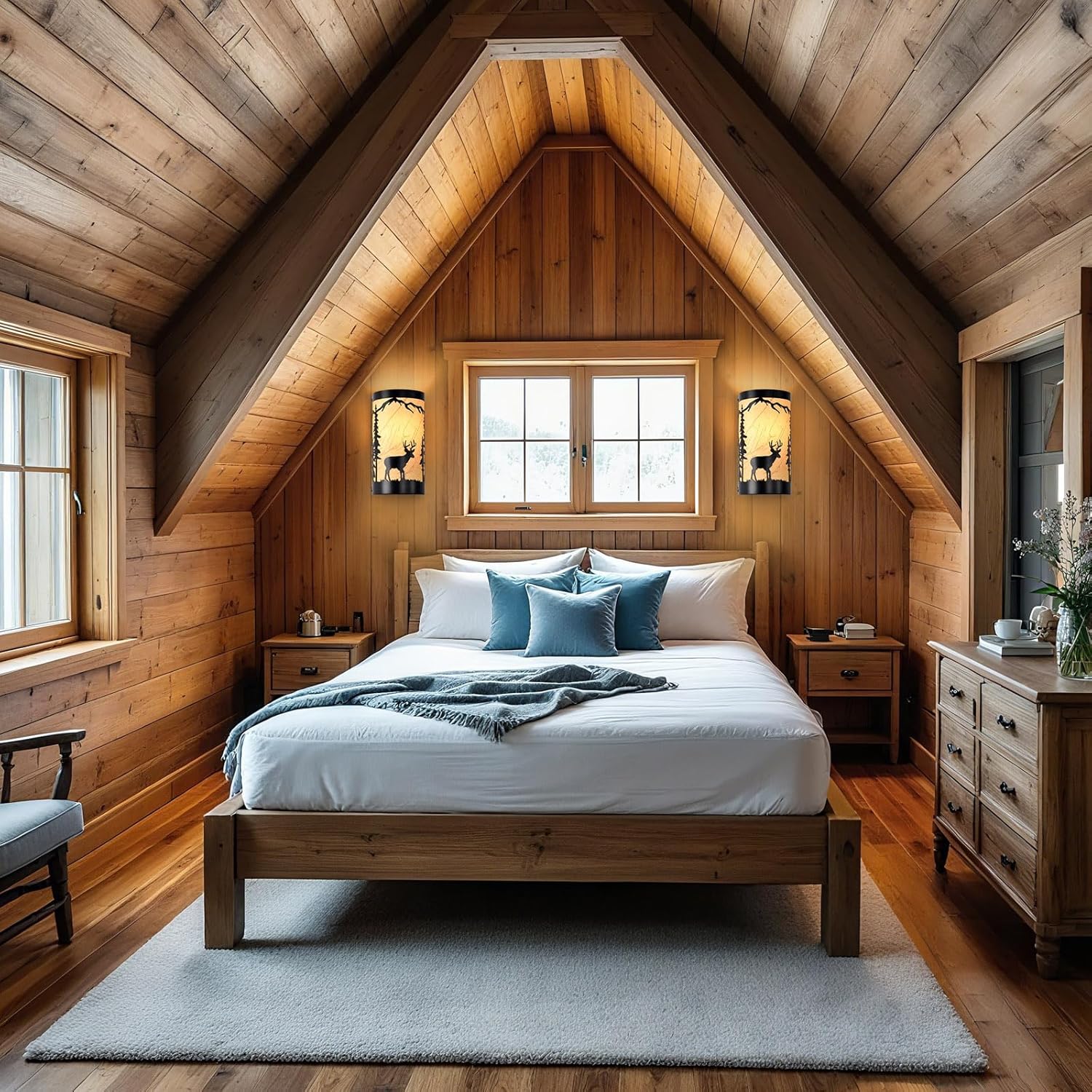 - Rustic Design: Farmhouse wall sconce is crafted from durable matte black metal,featuring intricate forest elements and a deer silhouette,yellow parchment paper adds a soft,warm glow,enhancing industrial aesthetic of the black wall sconce