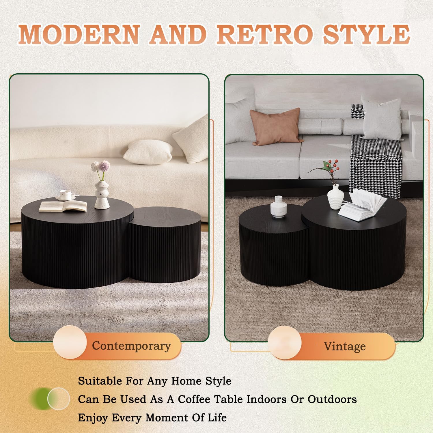 Round Nesting Coffee Table Modern Fluted Coffee Table Set of 2 Circle Drum Coffee Tables Small Round Accent Side End Table for Living Room No Assembly (Black B 27in)