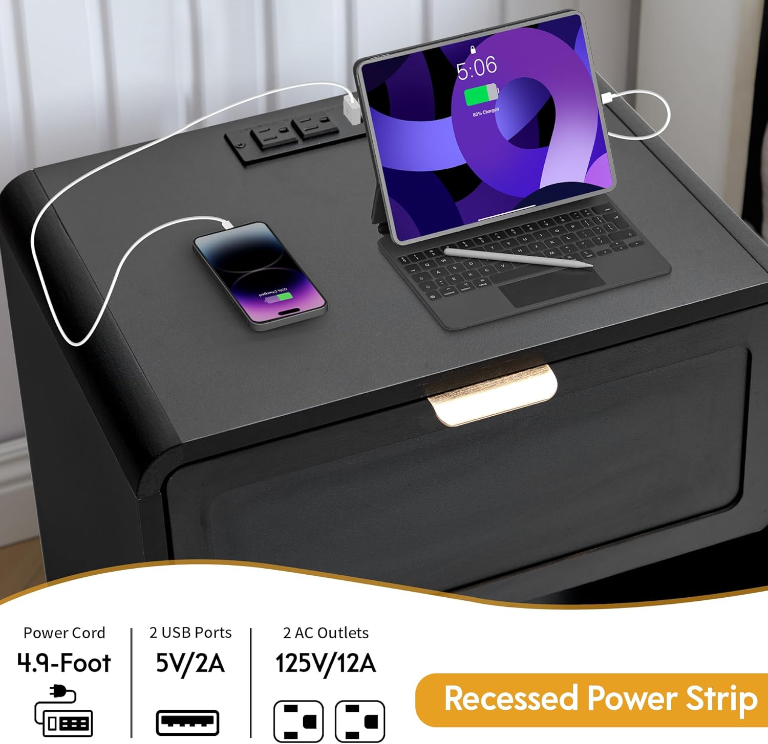 LEVNARY Nightstand Set of 2, Mid-Century Modern Bedside Table with Charging Station and Curved Top Corners, Wooden End Table for Farmhouse Bedroom Living Room (2, Black)