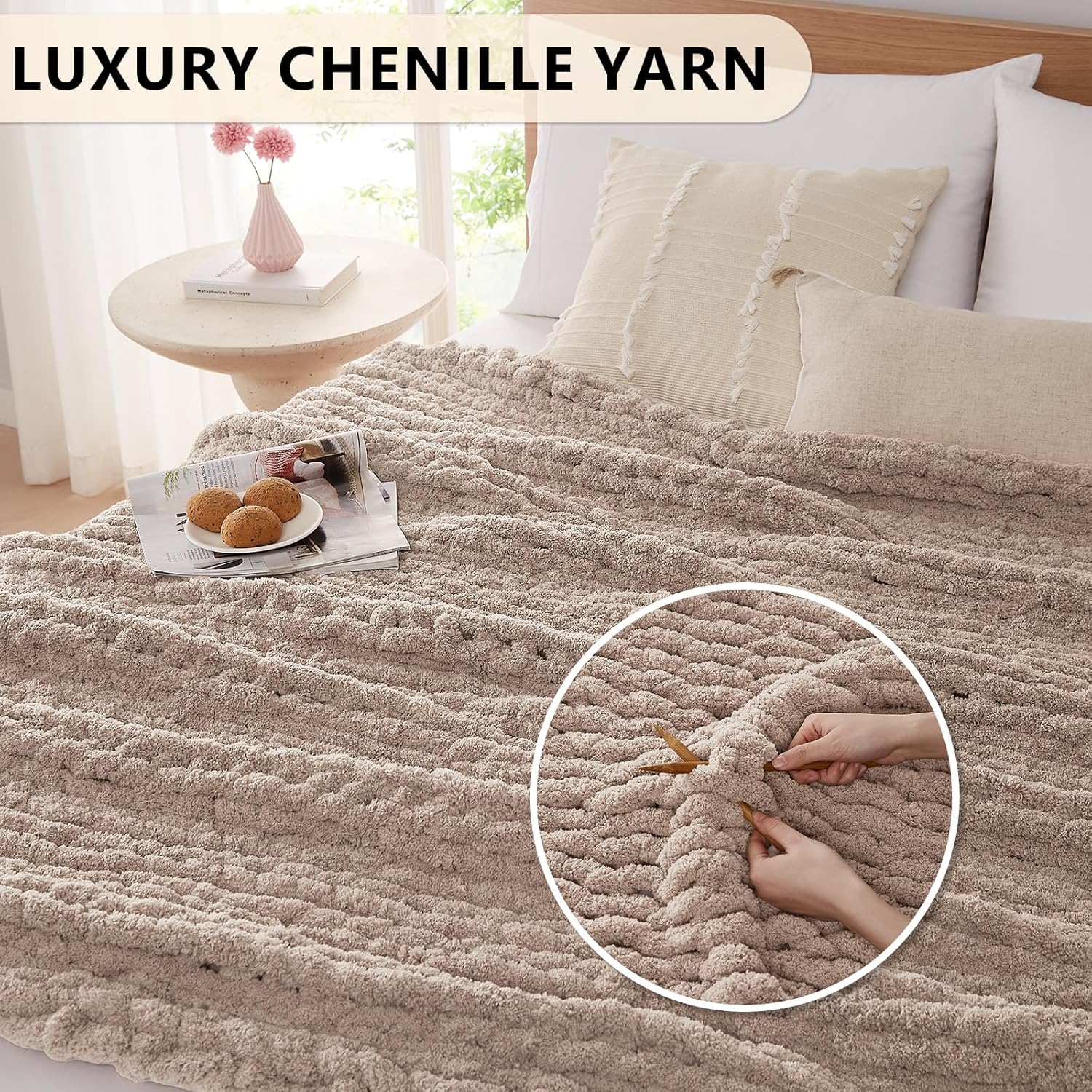 L'AGRATY Chunky Knit Blanket Throw: 80''x90'' Chenille Chunky Knitted Throw Blankets for Bed Couch - Handmade Thick Big Cable Knit Blanket - Large Crochet Rope Blankets for Home Decor(Light Taupe)