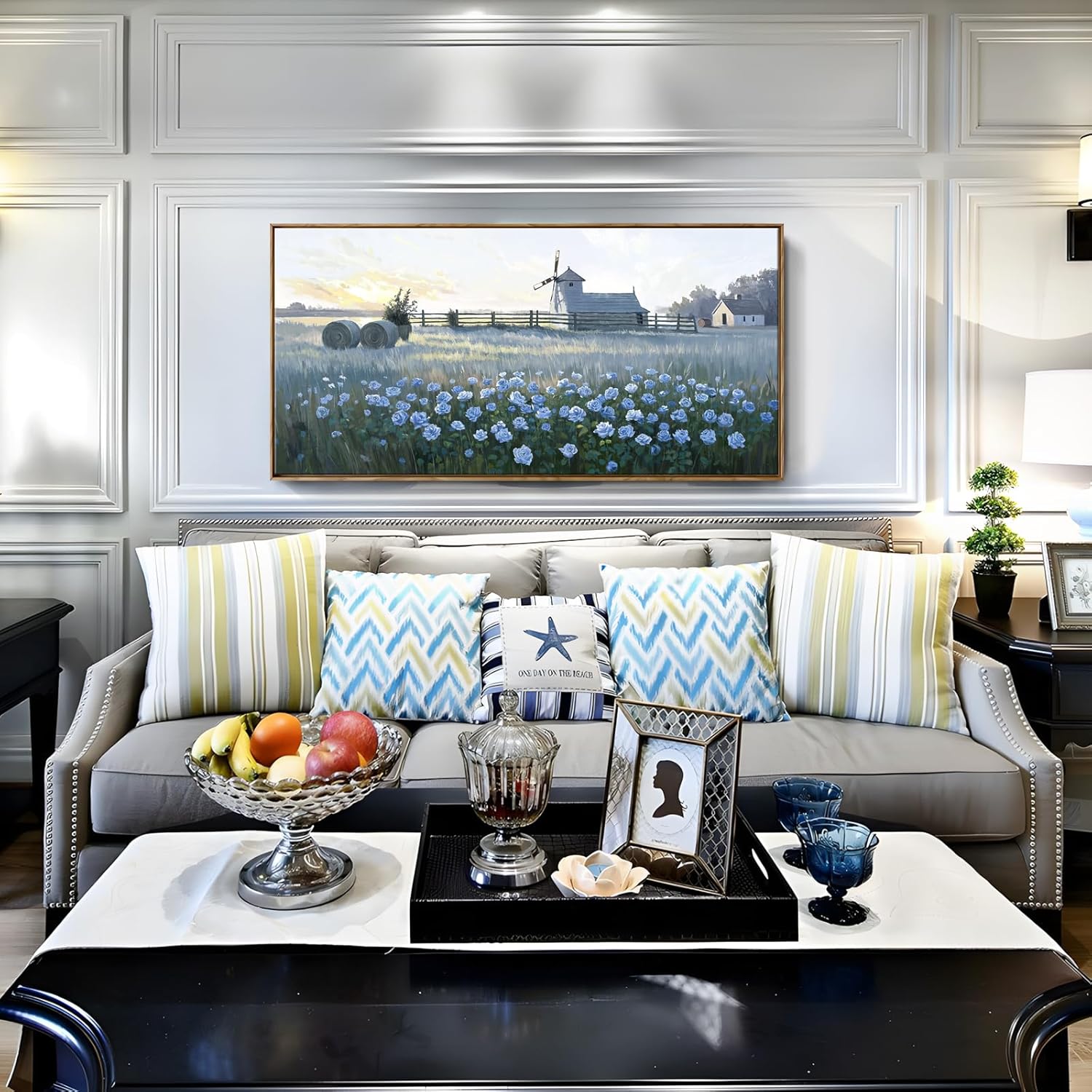- Country Breeze in Bloom: Immerse your space in the quiet romance of rural living with this charming blue barn flower framed canvas art. A serene field of blue garden flowers stretches beneath a warm sky, with a rustic farmhouse and vintage windmill tucked gently into the horizon. This piece blends floral grace with countryside simplicity—bringing a soft, cozy feel to your farmhouse entryway, dining room, or guest bedroom.