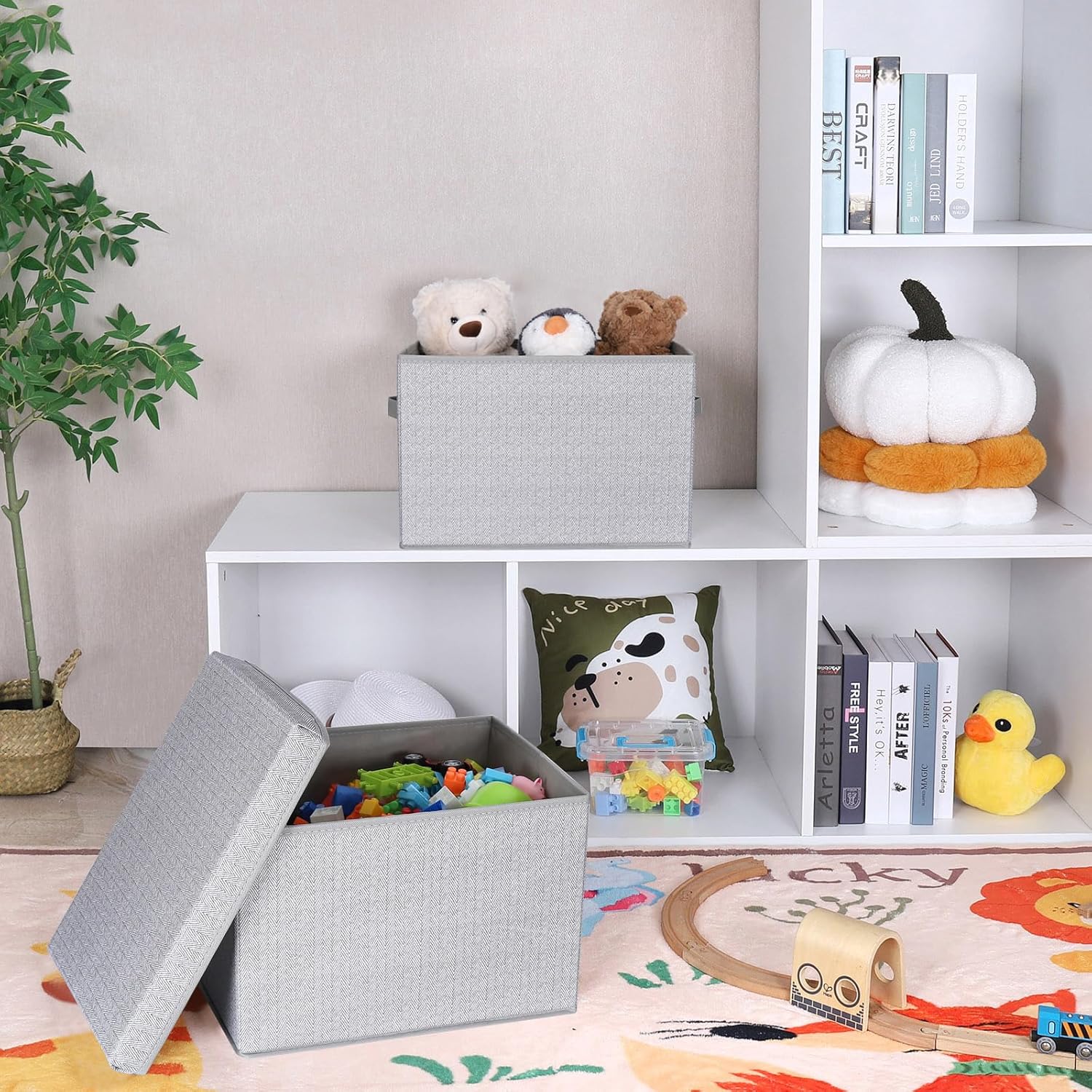 - Practical Design: The fabric storage bin features a lid to minimize dust entry, two sturdy side handles for easy portability, and a collapsible construction that saves space.