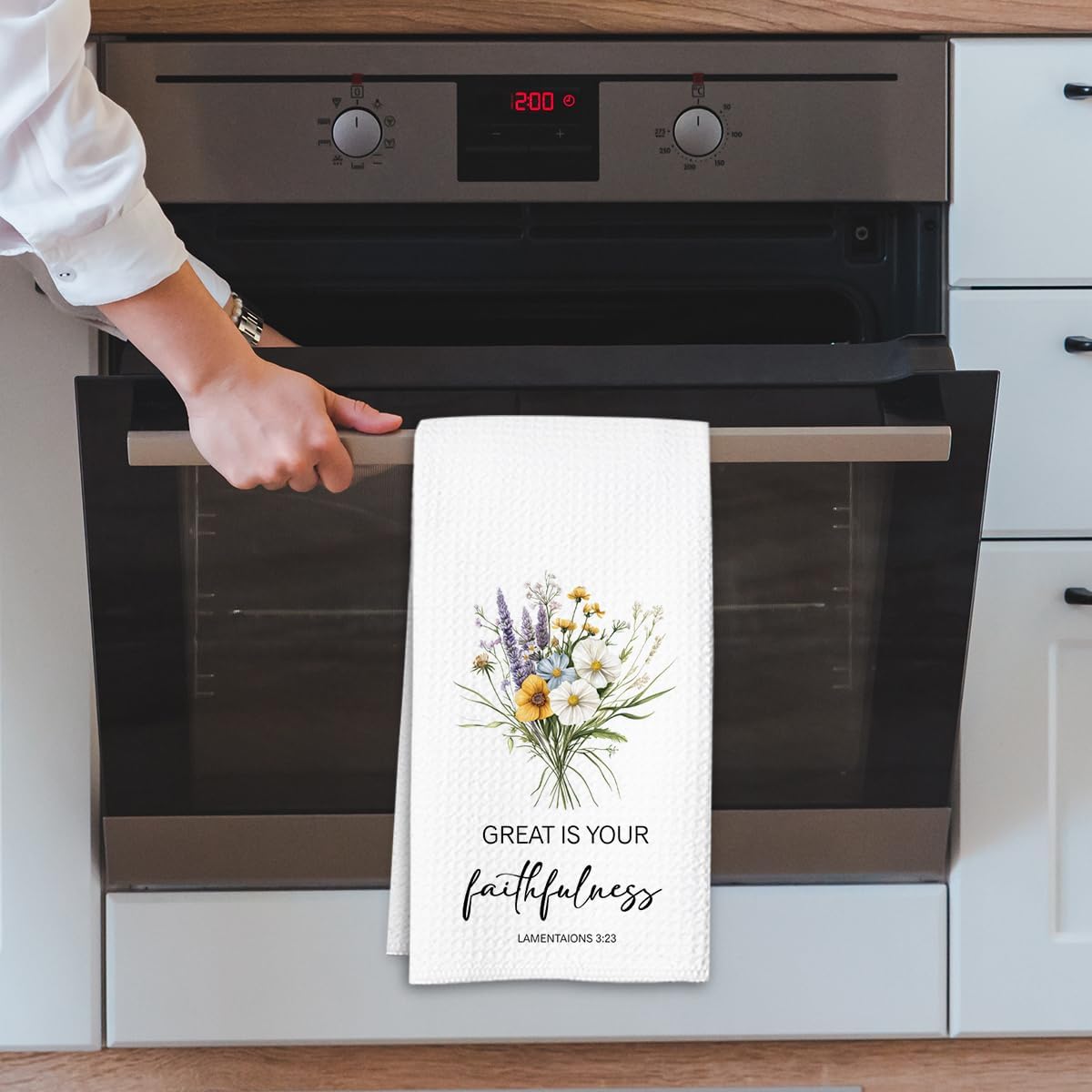 Christian Kitchen Towel, Waffle Weave Microfiber Scripture Hand Towel, Great is Your Faithfulness Bible Verse Farmhouse Decor for Kitchen Bathroom, Inspirational Gift for Women