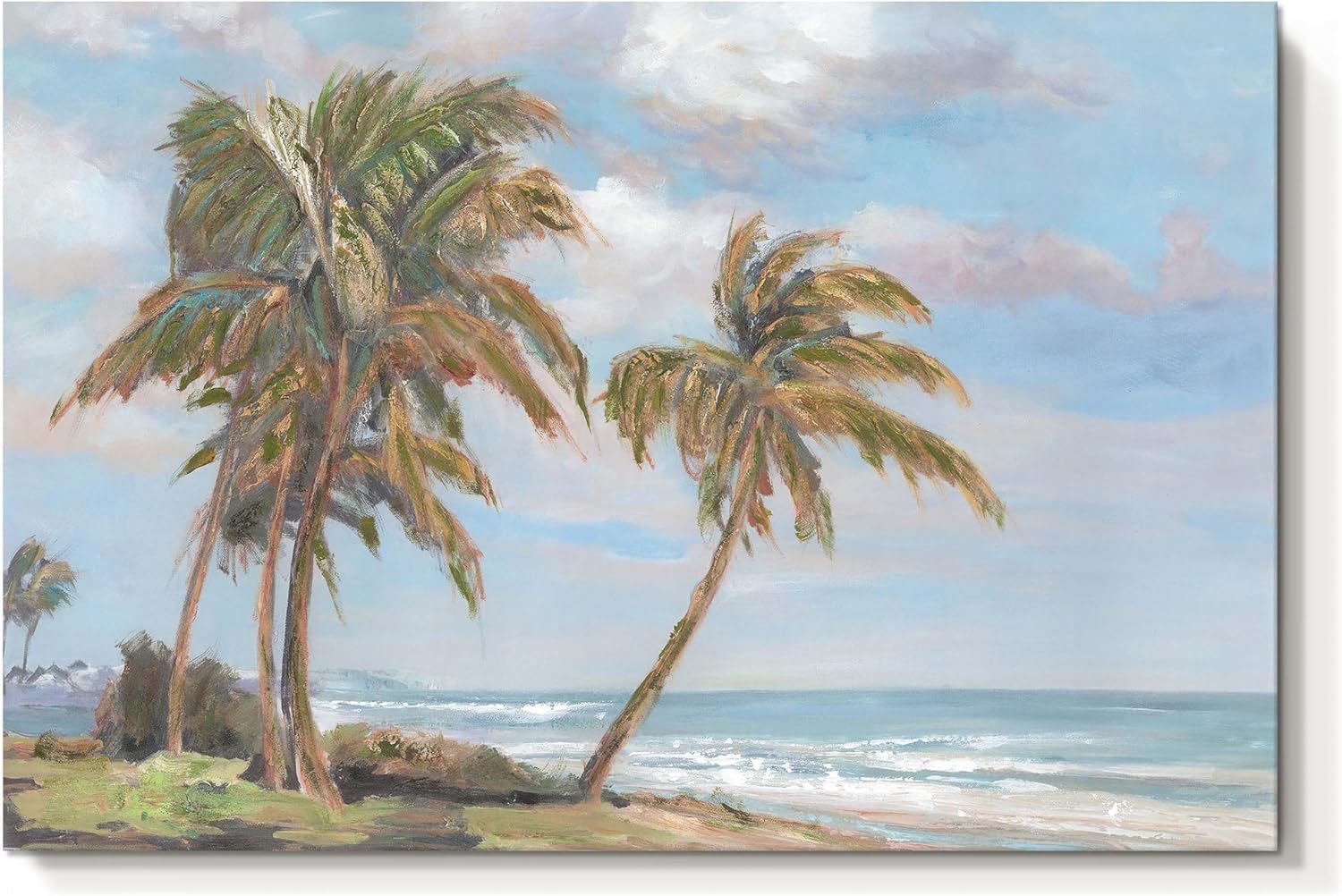 - Coastal palm tree Canvas Wall Art This 45"x30" framed masterpiece features a stunning beach palm tree scene with crashing ocean waves, perfect for creating a serene coastal escape in bathrooms, beach houses, or living rooms. UV-resistant inks prevent fading for years.