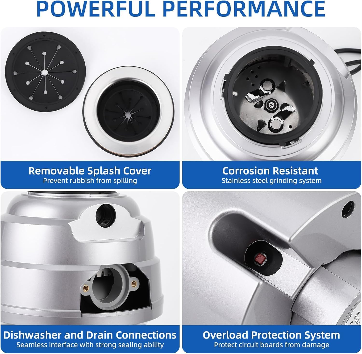 Powerful 3/4HP Stainless Steel Garbage Disposer, Dishwasher-Friendly and Continuous Feeding Waste Disposer, Grinding Material Four-Stage Grinding, Silver