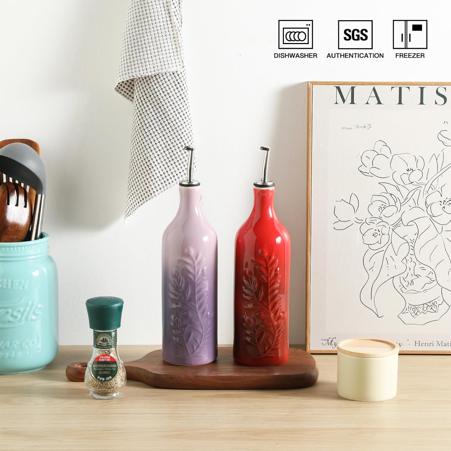 - Keep Liquid Fresh - This opaque porcelain vinegar and oil container protects your olive oil/ vinegar against harmful UV rays and makes it last longer.