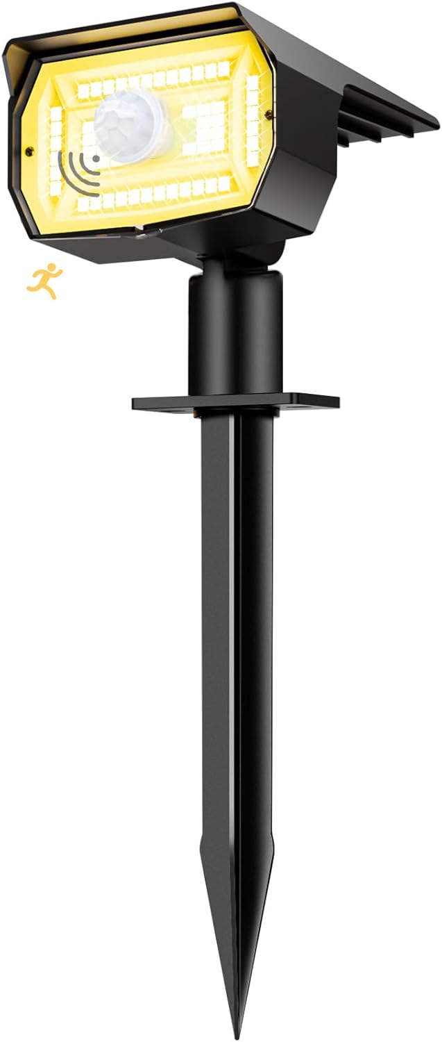 - 3 Lighting Modes & Motion Sensor: Solar spotlights have a built-in sensitive PIR motion sensor, which can easily capture motion. There are 3 modes:1.[Sensor light mode]: full brightness when the motion is detected,close when no motion 2.[Dim light sensor mode]:low brightness no motion,full brightness when the motion is detected 3.[ Constant light mode]: auto power on at night, auto power off during the day