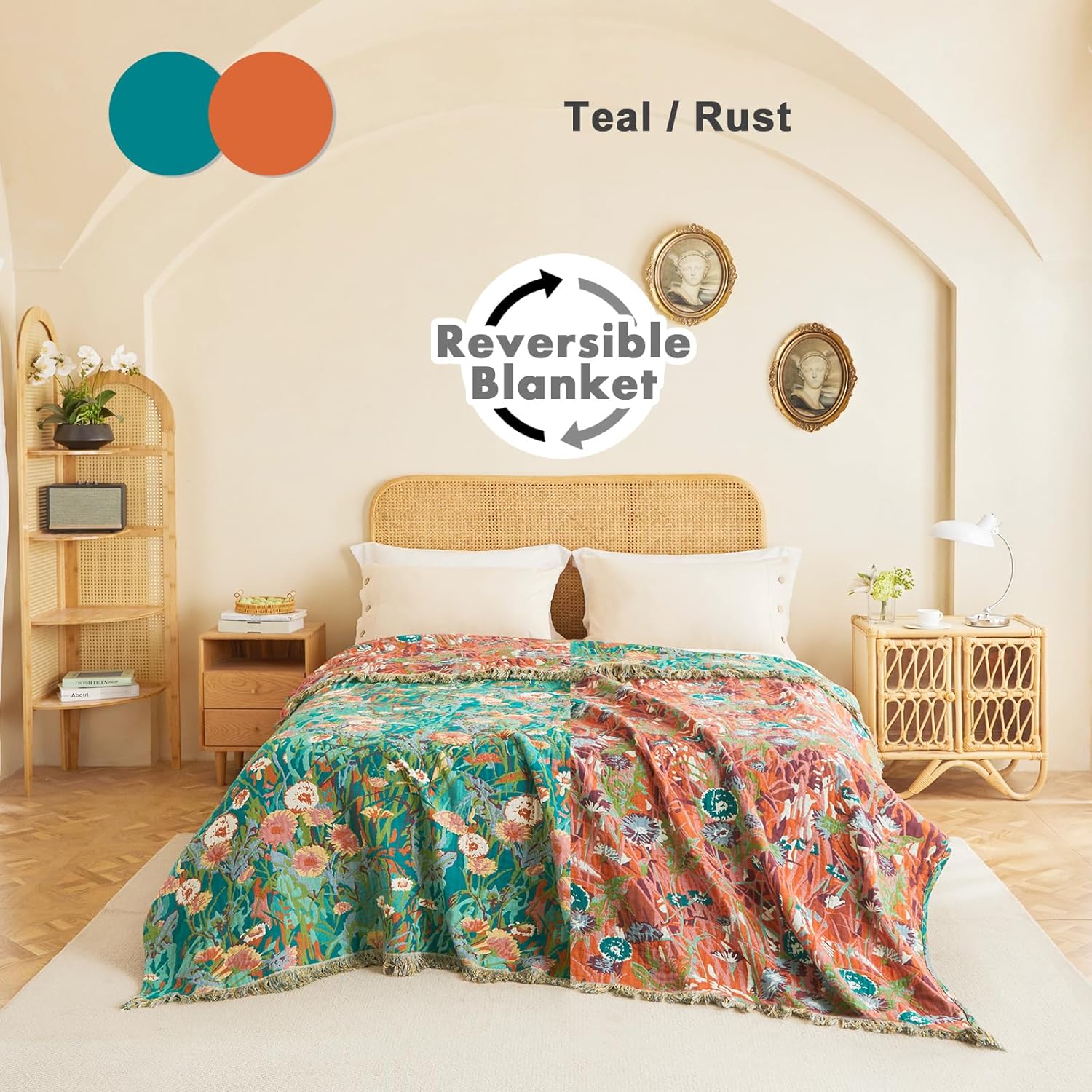 MSGKV Boho Throw Blanket for Bed Twin Size Cotton Muslin Breathable Floral Blanket 60"x80" Sofa Couch Blankets for All Seasons Lightweight Farmhouse Blankets Boho Home Decor