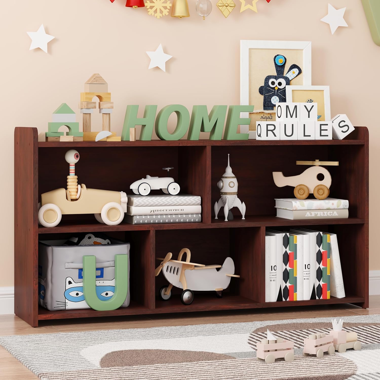 - ăLarge Capacity BookcaseăThis bookshelf features 5 large storage cubes to display and store your books, plants, photos and collections. The Bookcase can be used not only as a bookshelf, but also as a display cabinet, file cabinet and general storage cabinet that can be placed in bedrooms, living rooms and offices.
