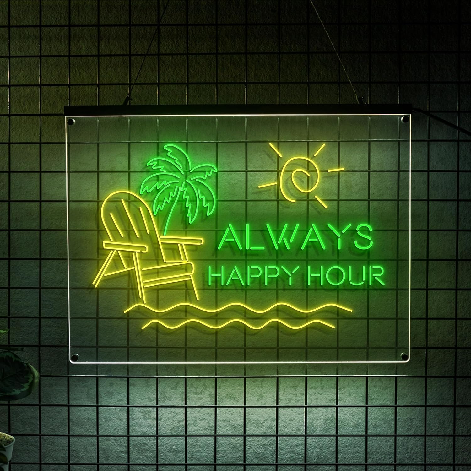 LIGHT UP LUXE Always Happy Hour Neon Sign, Bar Sign for Home Bar, Palm Tree & Sun Wall Decor, Summer Vibes Neon Light for Patio and Poolside