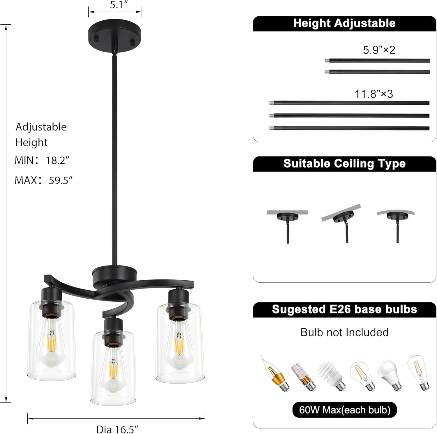 - 🔧 Flexible Adaptability to Various Spaces:Black dining light features an innovative adjustable rod design that offers five height settings (18.2 inches to 59.5 inches) to precisely match different ceiling heights and table requirements. Its unique structure adapts to sloped, flat, or arched ceilings, providing optimal lighting for spaces such as dining rooms, kitchens, or living rooms, and meeting the needs of a variety of scenarios.