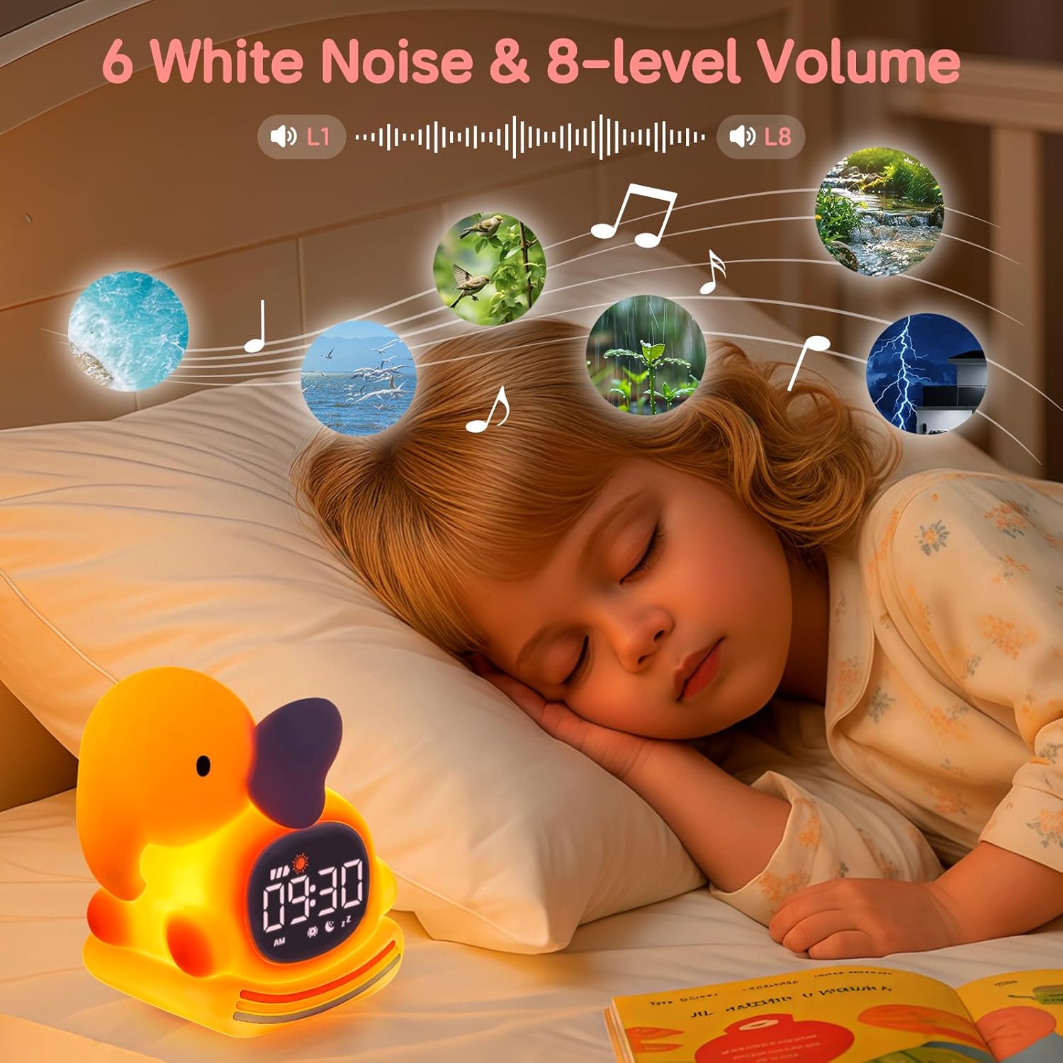 - 6 Soothing White Noise: Includes rain, ocean, and other calming sounds to block out background noise. With 8 volume levels, it helps children fall asleep faster and sleep more soundly.
