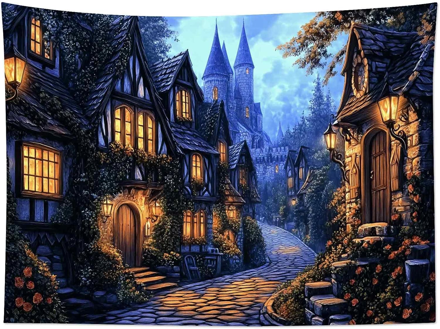 LB Vintage Castle Tapestry, Night Street Old House and Green Tree Wall Tapestry for Bedroom Aesthetic, Village Gothic Wall Art for Living Room Dorm Home Decor Ready to Hanging, 92.5 x 70.9 Inches