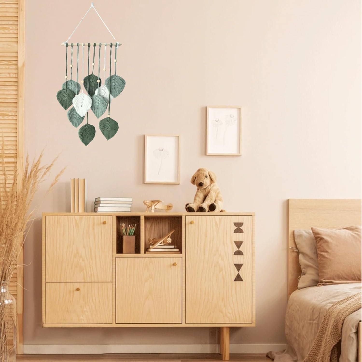 - 1.Bohemian Aesthetics: The small macrame wall hanging handmade woven Leaf Tapestry, featuring natural leaf motifs and macaron green, infuses your space with vivid bohemian flair, effortlessly adding unique cultural charm to your walls.