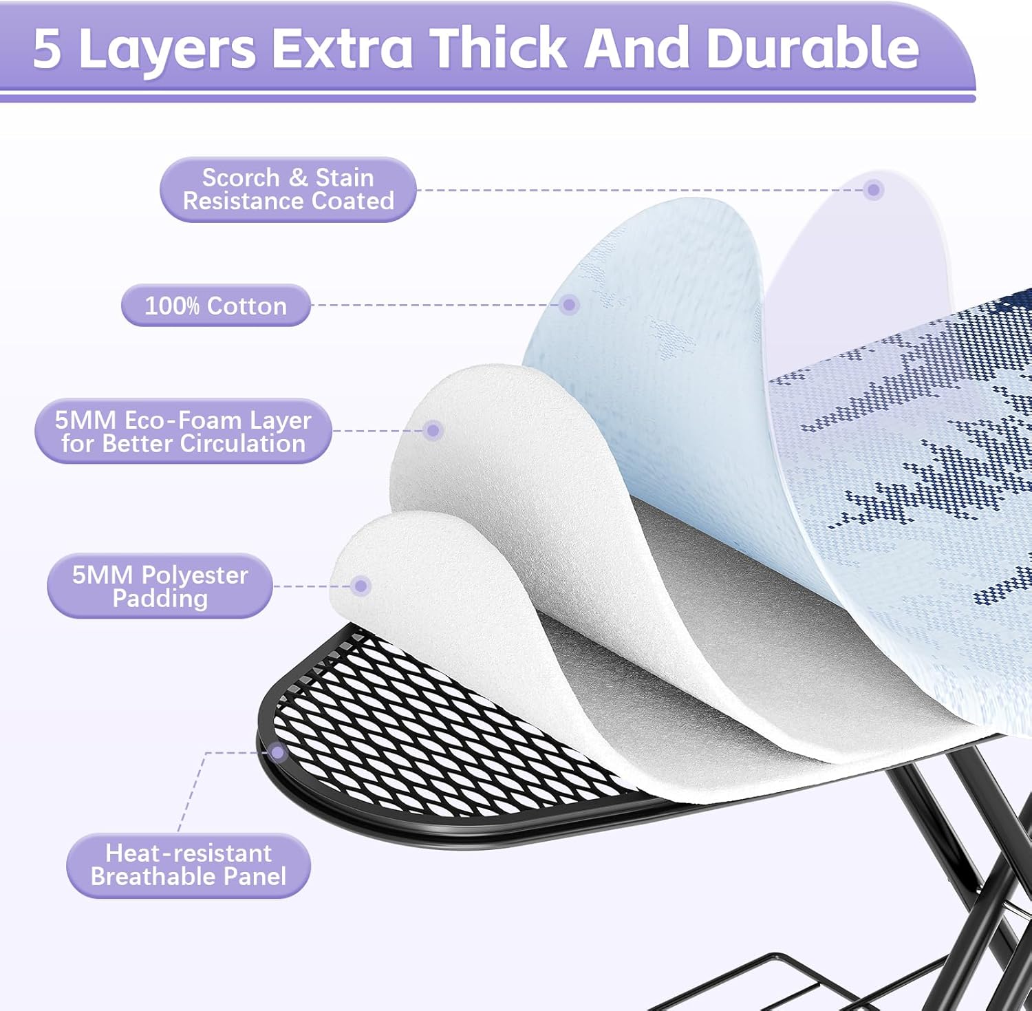 Full Size Ironing Board, 18x51 Iron Board with Metal Panel Stretchable Iron Rest, Adjustable Height Heavy Duty Heat & Scorch Resistant Cover Ironing Board, for Home, Laundry, Purple
