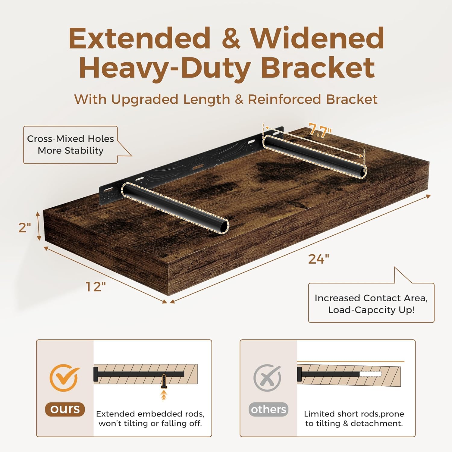 12 Inch Deep Floating Shelves, 24 x 12 Floating Shelf for Books, Rustic Wood Deep Wall Shelves for Home Storage & Display, 2" Thicked Shelves for Kitchen, Living Room, Bedroom, Rustic Brown, 2 Pack