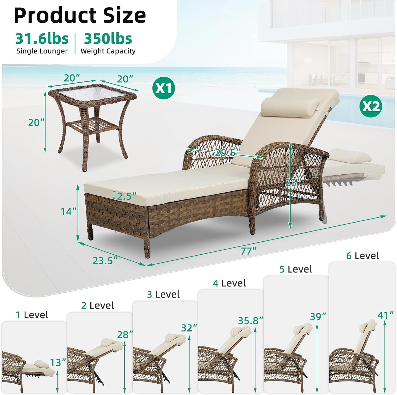 - Durable & Weather-Resistant Material: Crafted with hand-woven PE rattan and a powder-coated steel frame, this outdoor chaise lounge set is built to withstand all weather conditions, offering long-lasting durability without fading or cracking. Light in weight but heavy on strength, the wicker lounge chair supports up to 350 pounds while weighing just 31.6 lbs