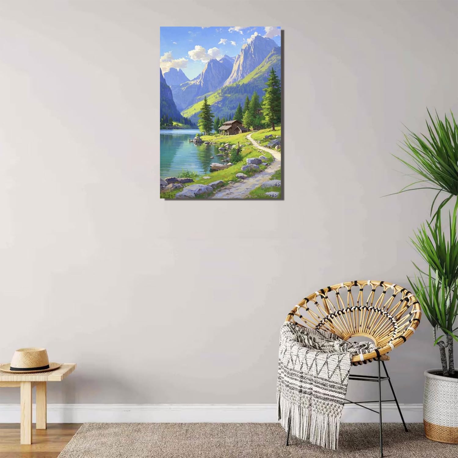 Landscape wall painting of mountain forest lakeside cabin under blue sky and white clouds natural oil painting poster suitable for living room bedroom office
