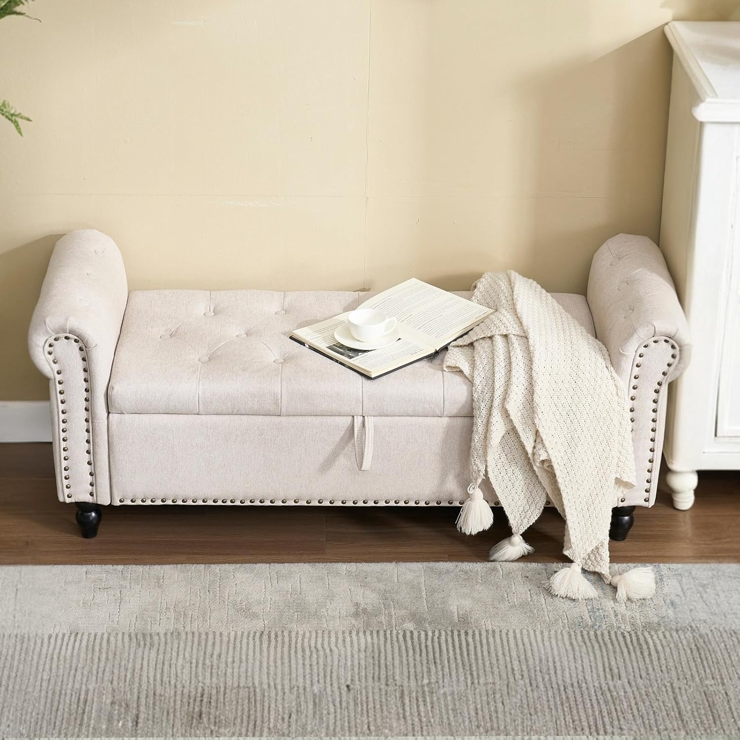 - ·Modern Design: Our storage ottoman showcases deep button tufting and elegantly rolled arms, capturing the essence of a truly modern piece. With a sophisticated structure, this bedroom storage bench embodies a minimalist style that prioritizes comfort and practicality.Diamond Stitch Button Tufting: The button-tufted stitching on the lid enhances the modern designthis of this end of bed bench. The diamond stitch pattern introduces subtle texture while maintaining optimal comfort.