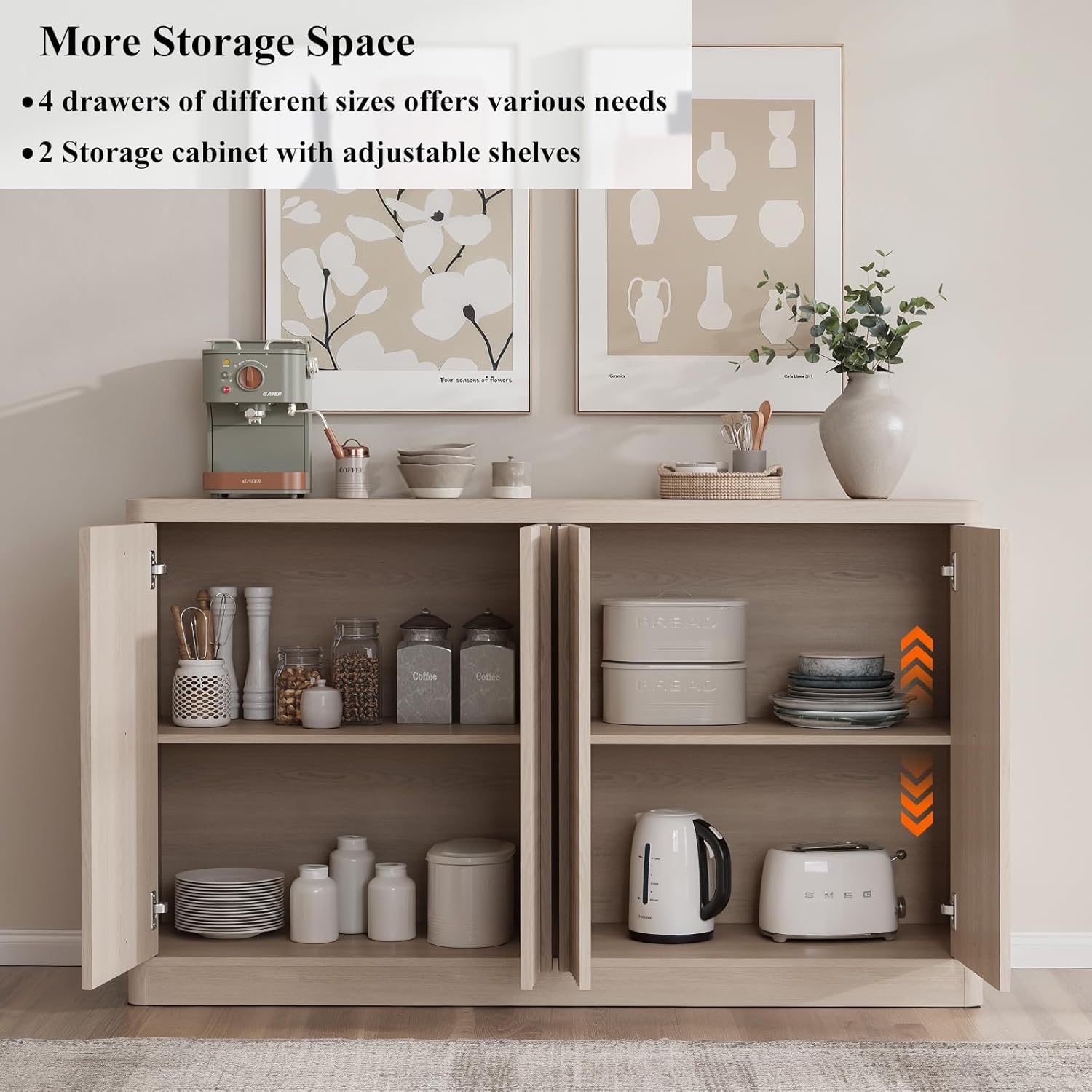 - ăFlexible & Large Capacityă15.6"D x 120"W x 34.6"H. This sideboard buffet cabinet provides ample, versatile storage with a spacious tabletop for serving or dĂ©cor. 2 adjustable shelves help organize appliances and tableware in this kitchen buffet storage cabinet