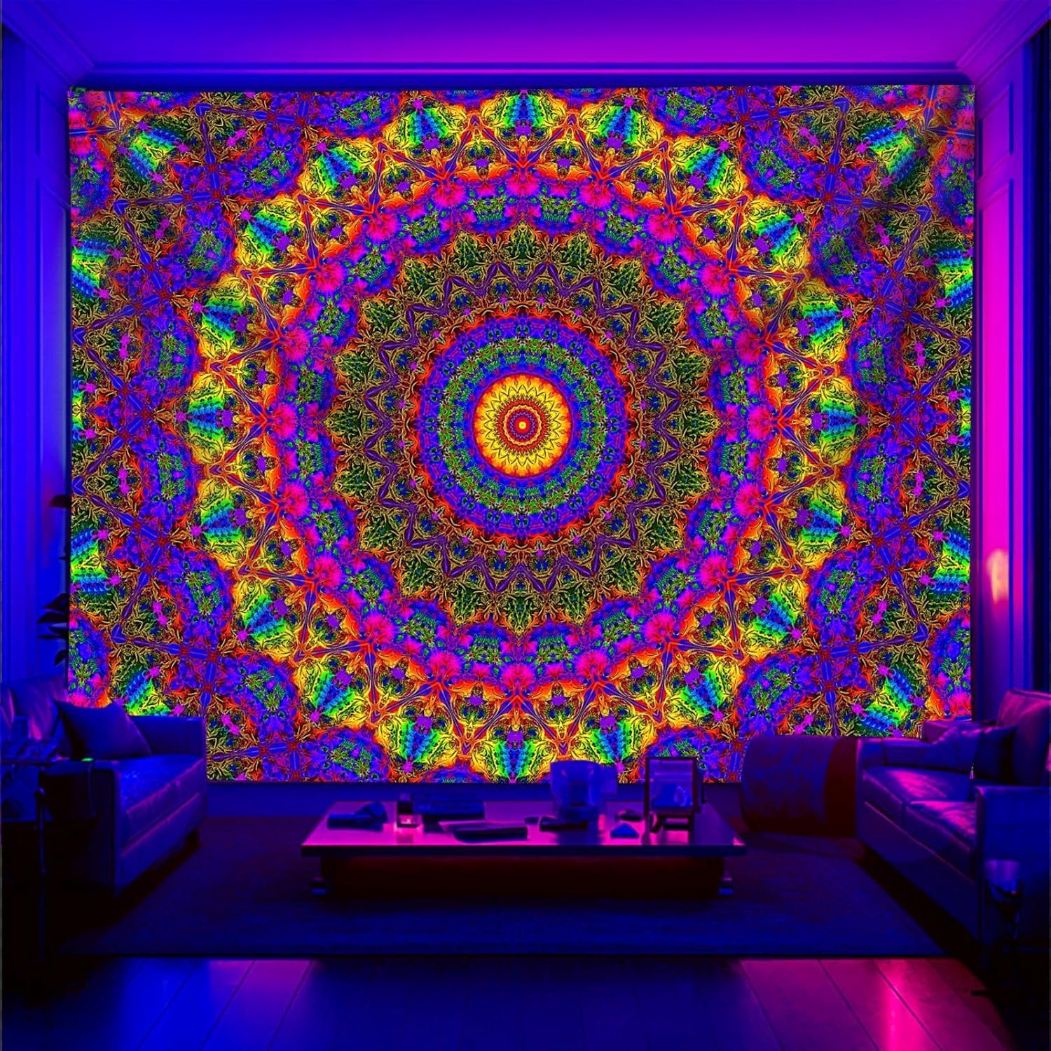 PSYHILAR Blacklight Mandala Boho Tapestry, Black Light Bohemian Hippie Poster for Adults and Teens, Aesthetic Colorful UV Reactive Wall Art Decor for Bedroom (60 x 50 Inches)