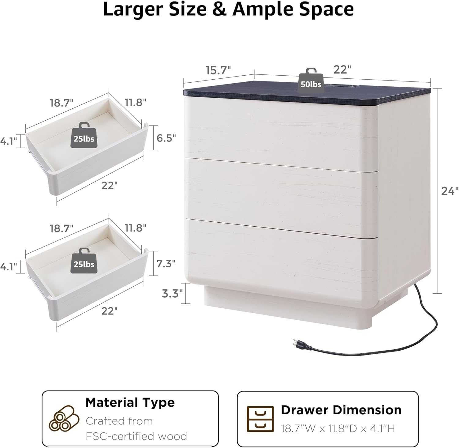 JXQTLINGMU 22" Modern Nightstand with Charging Station, Large Push-to-Open End Table, Wood Bedside Table w/Curved Profile Design, Handleless 3 Drawer Night Stand for Bedroom, Living Room, Off White