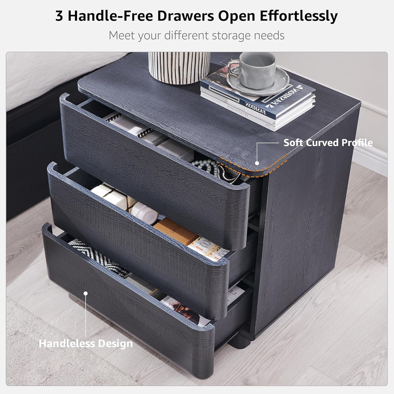 JXQTLINGMU 22" Modern Nightstand with Charging Station, Large Push-to-Open End Table, Wood Bedside Table w/Curved Profile Design, Handleless 3 Drawer Night Stand for Bedroom, Living Room, Black