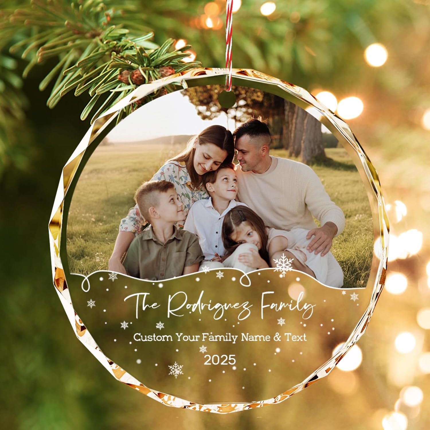 - 💎 Custom Crystal Family Ornament – Crafted from premium clear crystal, this ornament allows you to upload a family photo and add names or year. A beautiful way to celebrate your family’s holiday memories